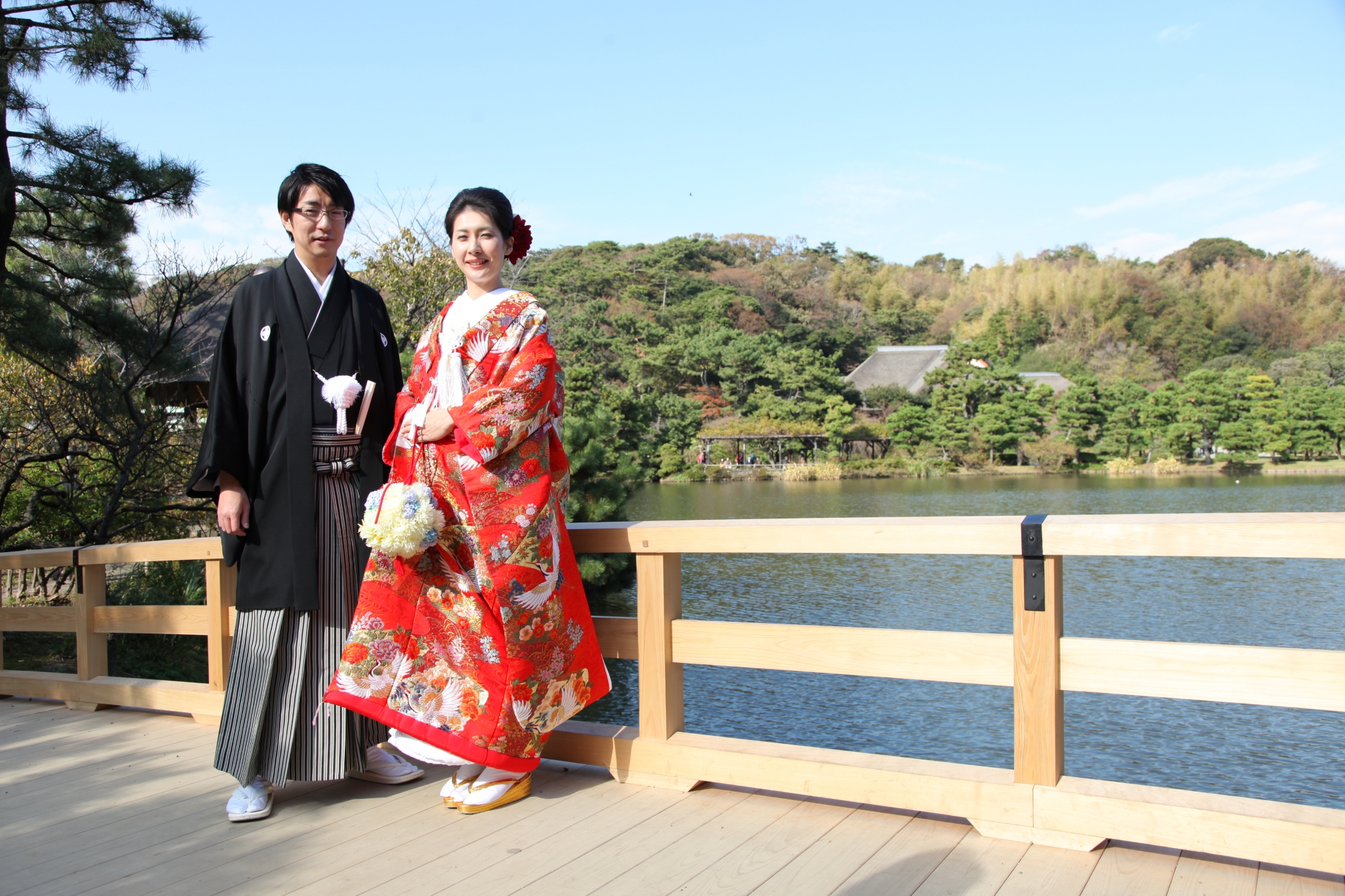 三渓園ののフォトウエデンング。三渓園のロケーションフォト。広大な敷地の中に大きな池や歴史的建造物があり、国指定名勝です。横浜の和装撮影、ロケーションの素晴らしい庭園で撮影します。京都から移築した三重塔も見えます。美しい純日本庭園 自然も美しく四季折々の風景を魅せてくれます。結婚式の前撮り撮影ならウィズプロデュースにお任せ下さい。写真・動画に残します。
