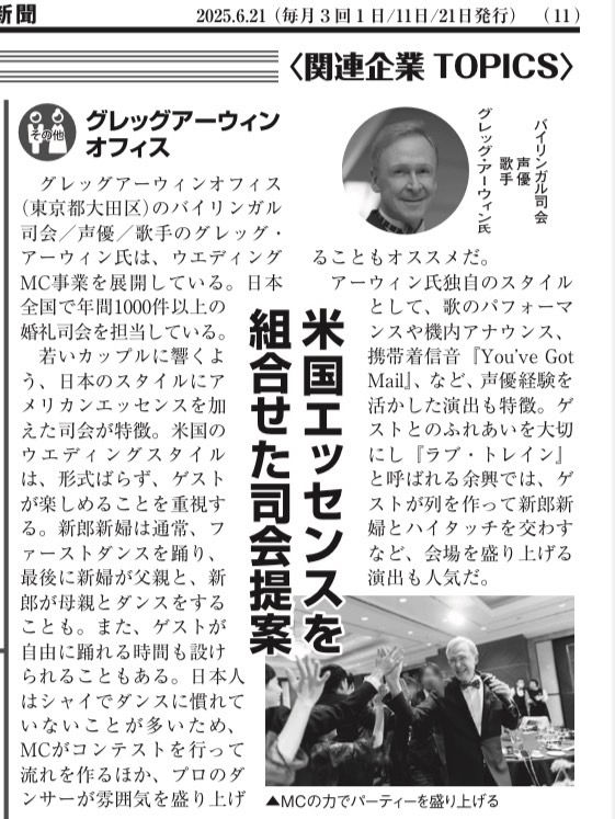 バイリンガル司会のグレッグ・アーウィンは日本での「You've Got Mail」(メール着信音)の声として知られるほか、 全日空(ANA)、Starlux Airlinesの機内アナウンスも担当。東京ディズニーランドのナレーションで有名となる。ケンタッキーフライドチキン、パナソニック、アイリスオーヤマ、 花王、日産などのCMナレーションも多数。Netflix『10DANCE』にMC役で出演。