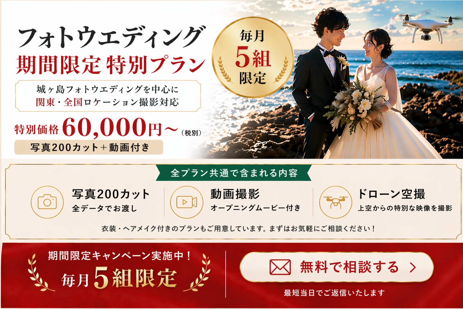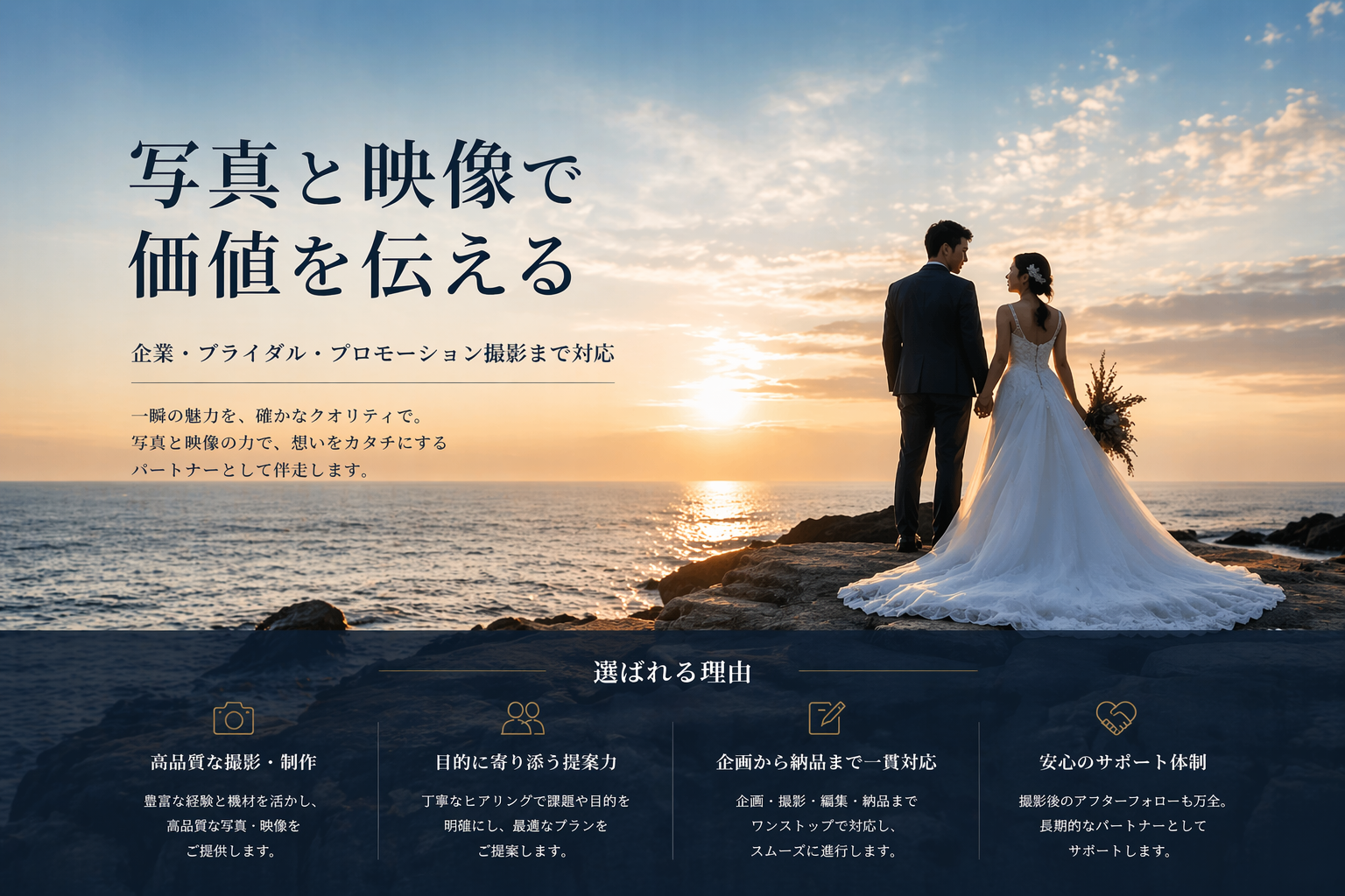 写真・衣装・ヘアメイク・映像制作/オープニングムービー・ドローン撮影・送迎無料。キャンペーン・4月~7月の予約受付中!